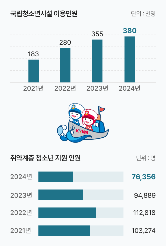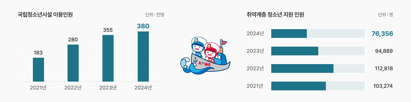 국립청소년시설 이용인원 (단위 천명) 2021년 183, 2022년 280, 2023년 355, 2024년 380 취약계층 청소년 지원 인원 (단위 명) 2024년 76,356 2023년 94,889 2022년 112,818 2021년 103,274