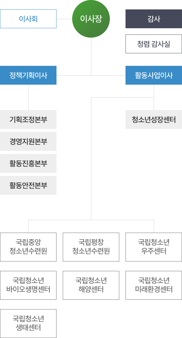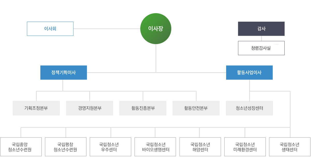 이 이미지는 기관의 조직도입니다. 최상단에는 '이사회'와 '감사'가 있으며, 감사 아래에는 '청렴감사실'이 있습니다. 중앙에는 '이사장'이 위치하고, 이사장 아래에 두 명의 이사가 있습니다. 왼쪽은 '정책기획이사'로, 하위 조직에 '기획조정본부', '경영지원본부', '활동진흥본부', '활동안전본부'가 있습니다. 이와 연결된 소속 기관은 '국립중앙청소년수련원', '국립평창청소년수련원', '국립청소년우주센터', '국립청소년바이오생명센터', '국립청소년해양센터'입니다. 오른쪽은 '활동사업이사'로, 하위 조직에 '활동안전본부', '청소년성장센터'가 있으며, 연결된 소속 기관은 '국립청소년해양센터', '국립청소년미래환경센터', '국립청소년생태센터'입니다.