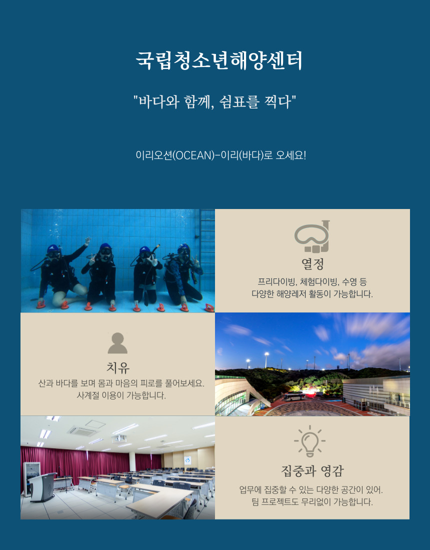 · 해양체험관(오션뷰): 바다를 보며 업무와 쉼을 동시에 수영장과 해양체험을 가족과 함께 즐길 수 있는 곳 입니다.